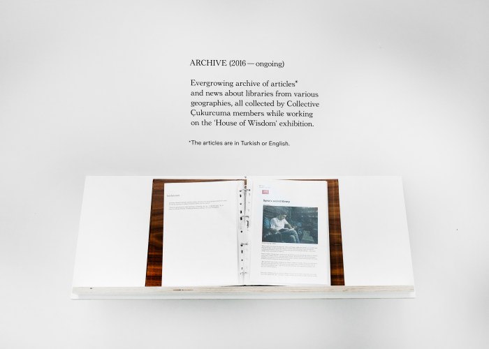 **House of Wisdom is a mobile and ever-evolving library/exhibition curated by Collective Çukurcuma. It was previously shown at Dzialdov (Berlin, 2017), IKSV Building (Public program of the 15th Istanbul Biennial, Istanbul, 2017) and Framer Framed (Amsterdam, 2017).